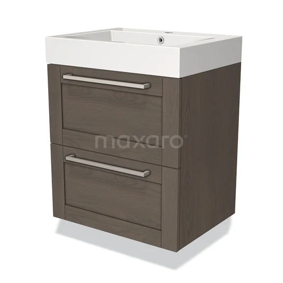 Modulo Waschtische | 60 cm Dunkelbraune Eiche Rahmen front Mineralguss 2 übereinanderliegende Schubladen
