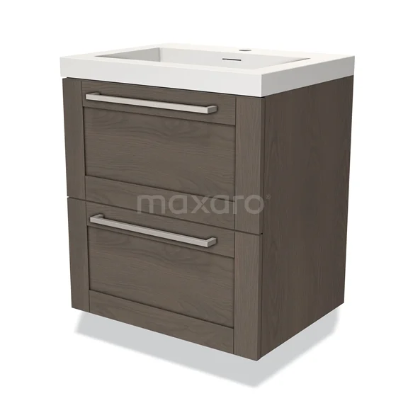 Modulo Waschtische | 60 cm Dunkelbraune Eiche Rahmen front Solid Surface 2 übereinanderliegende Schubladen