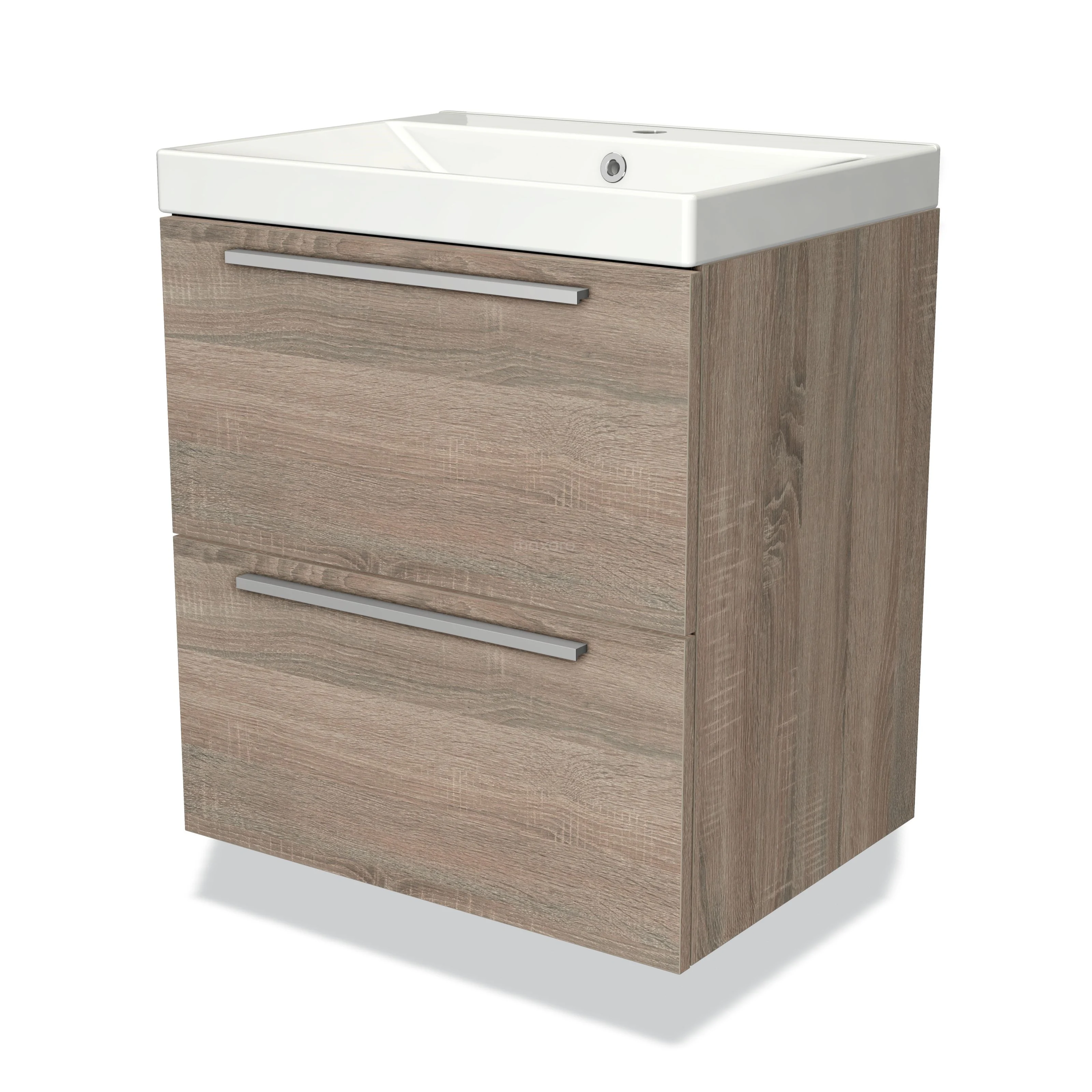 Modulo Waschtische | 60 cm Eiche Flach front Keramik 2 übereinanderliegende Schubladen