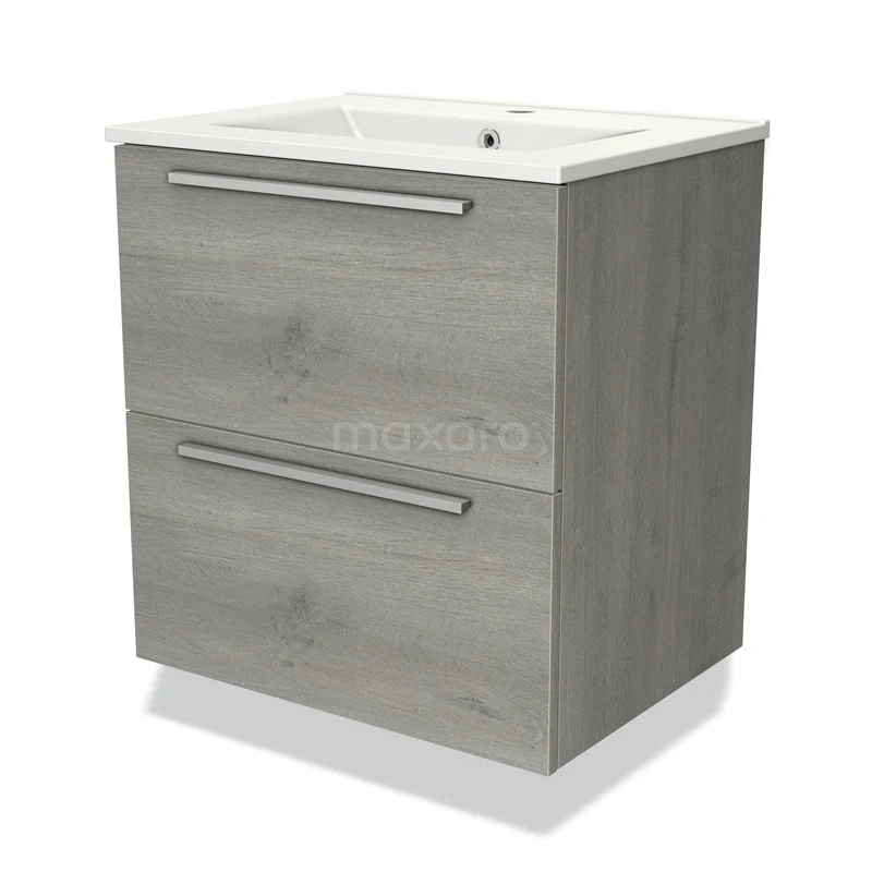 Modulo Waschtische | 60 cm Graue Eiche Flach front Keramik 2 übereinanderliegende Schubladen