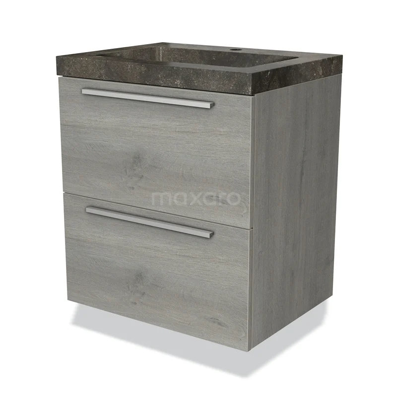Modulo Waschtische | 60 cm Graue Eiche Flach front Naturstein 2 übereinanderliegende Schubladen