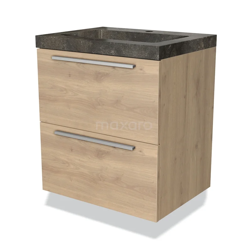 Modulo Waschtische | 60 cm Hellbraune Eiche Flach front Naturstein 2 übereinanderliegende Schubladen