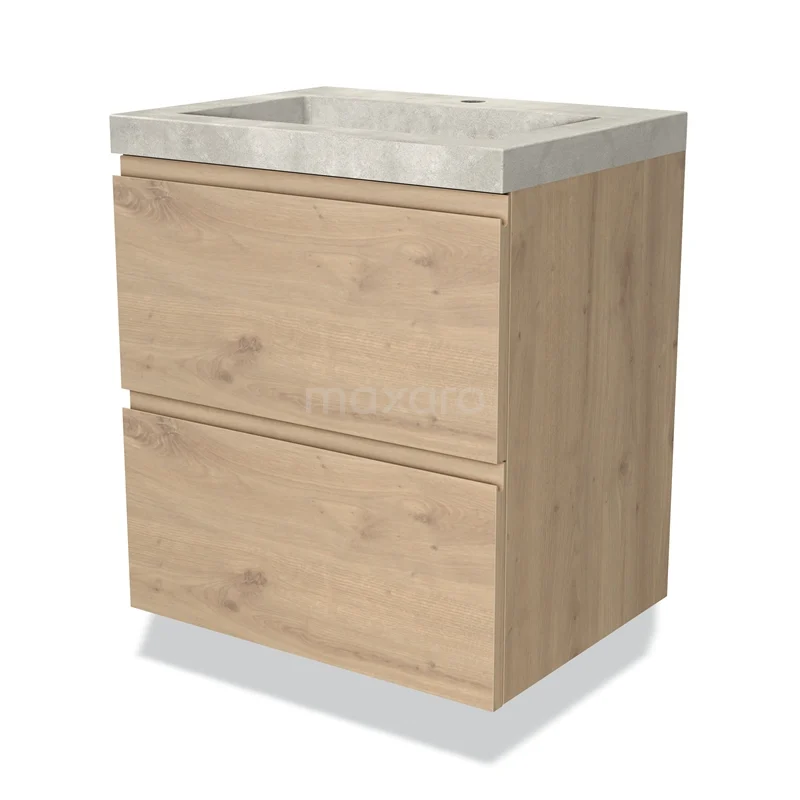Modulo Waschtische | 60 cm Hellbraune Eiche Grifflos front Beton 2 übereinanderliegende Schubladen