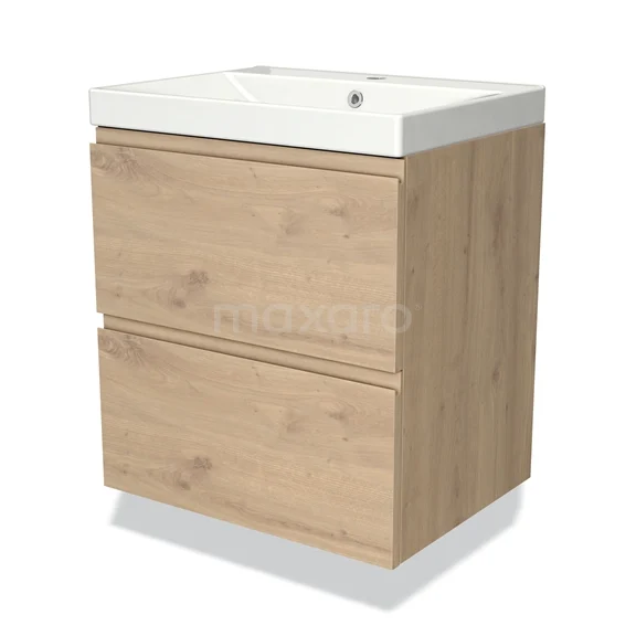 Modulo Waschtische | 60 cm Hellbraune Eiche Grifflos front Keramik 2 übereinanderliegende Schubladen