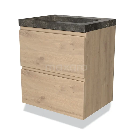 Modulo Waschtische | 60 cm Hellbraune Eiche Grifflos front Naturstein 2 übereinanderliegende Schubladen