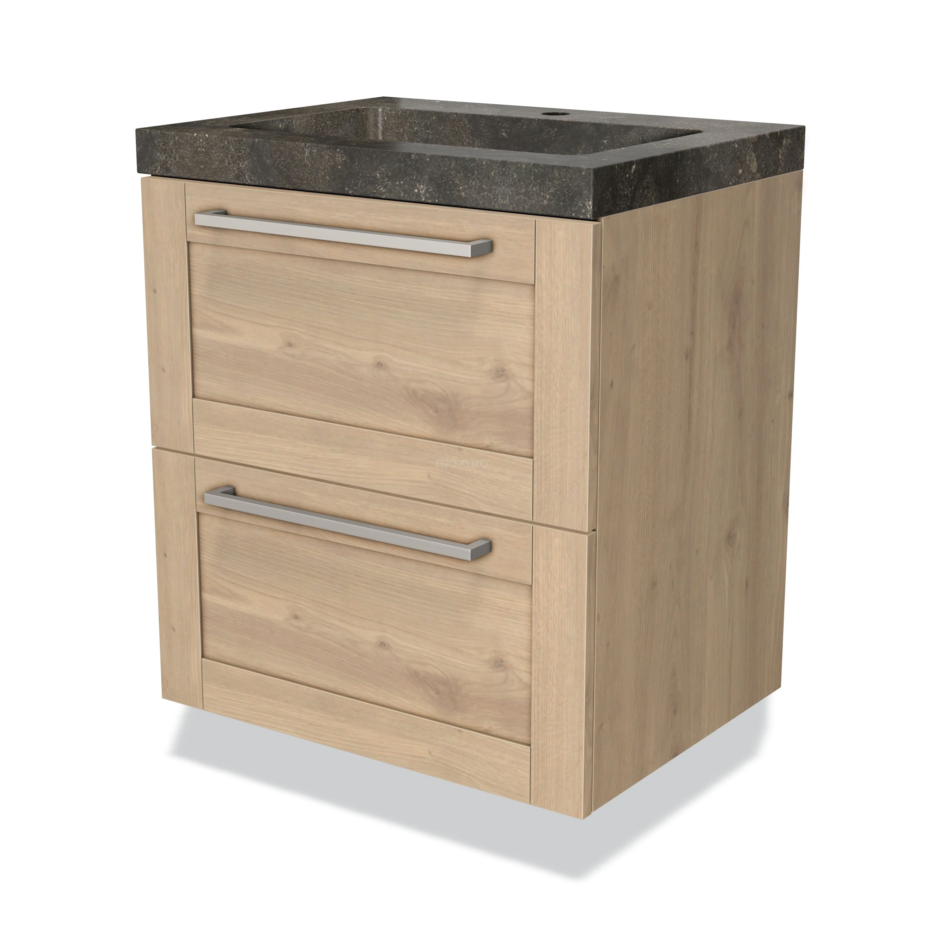 Modulo Waschtische | 60 cm Hellbraune Eiche Rahmen front Naturstein 2 übereinanderliegende Schubladen