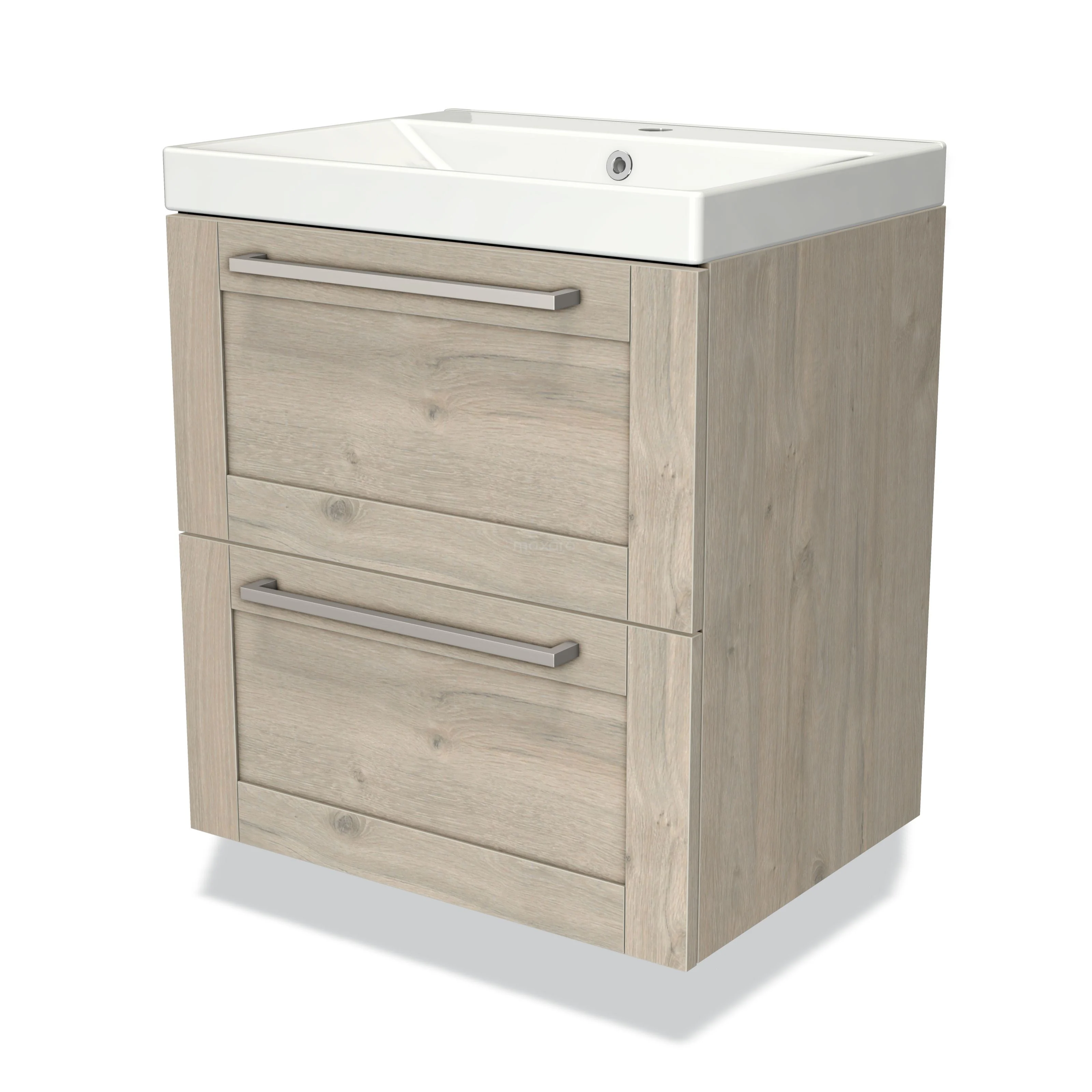 Modulo Waschtische | 60 cm Hellgraue Eiche Rahmen front Keramik 2 übereinanderliegende Schubladen
