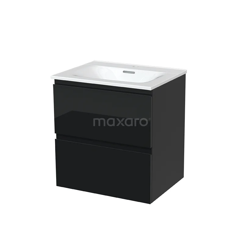 Modulo Waschtische | 60 cm Hochglanz Schwarz Grifflos front Keramik 2 übereinanderliegende Schubladen