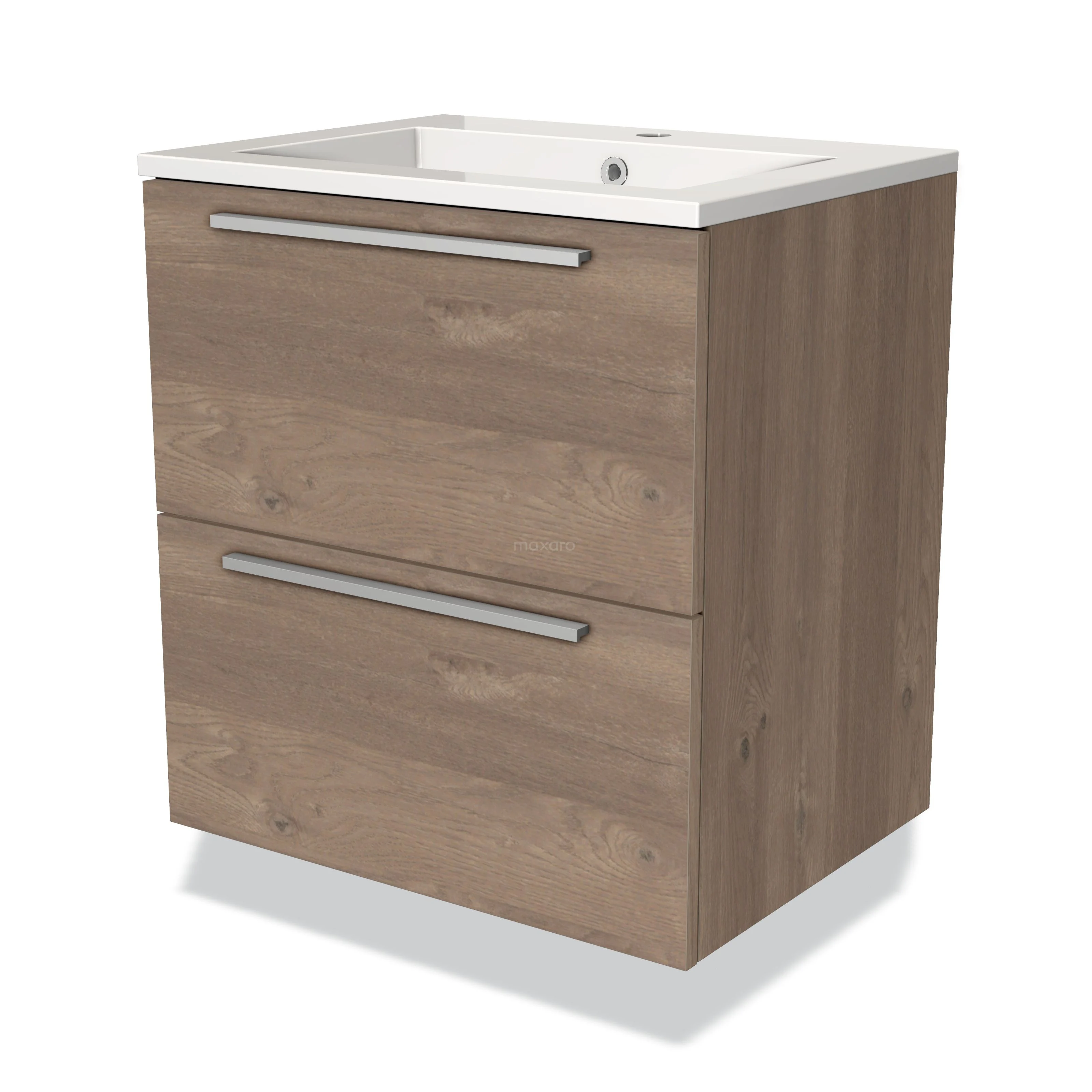 Modulo Waschtische | 60 cm Mittelbraune Eiche Flach front Mineralguss 2 übereinanderliegende Schubladen