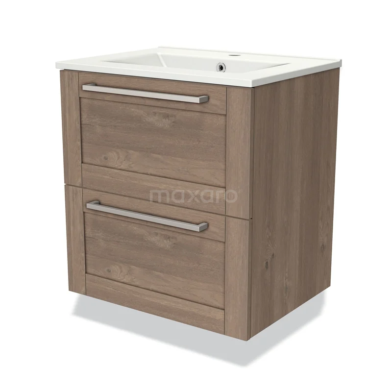 Modulo Waschtische | 60 cm Mittelbraune Eiche Rahmen front Keramik 2 übereinanderliegende Schubladen