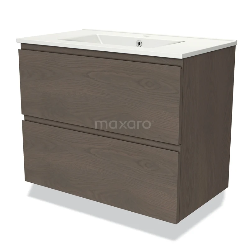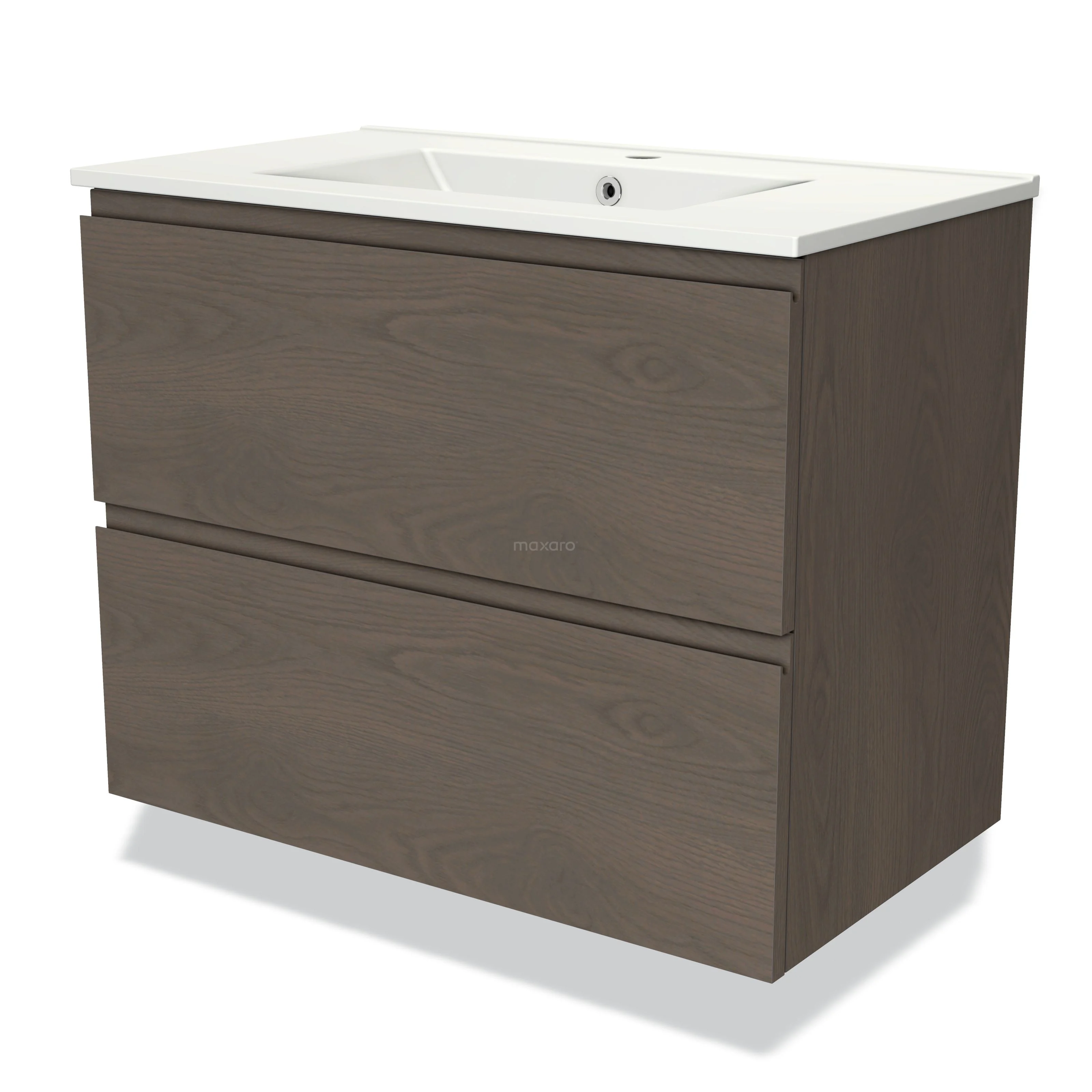 Modulo Waschtische | 80 cm Dunkelbraune Eiche Grifflos front Keramik 2 übereinanderliegende Schubladen