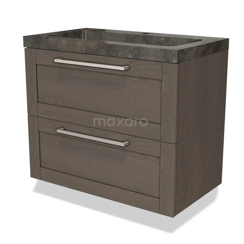 Modulo Waschtische | 80 cm Dunkelbraune Eiche Rahmen front Naturstein 2 übereinanderliegende Schubladen
