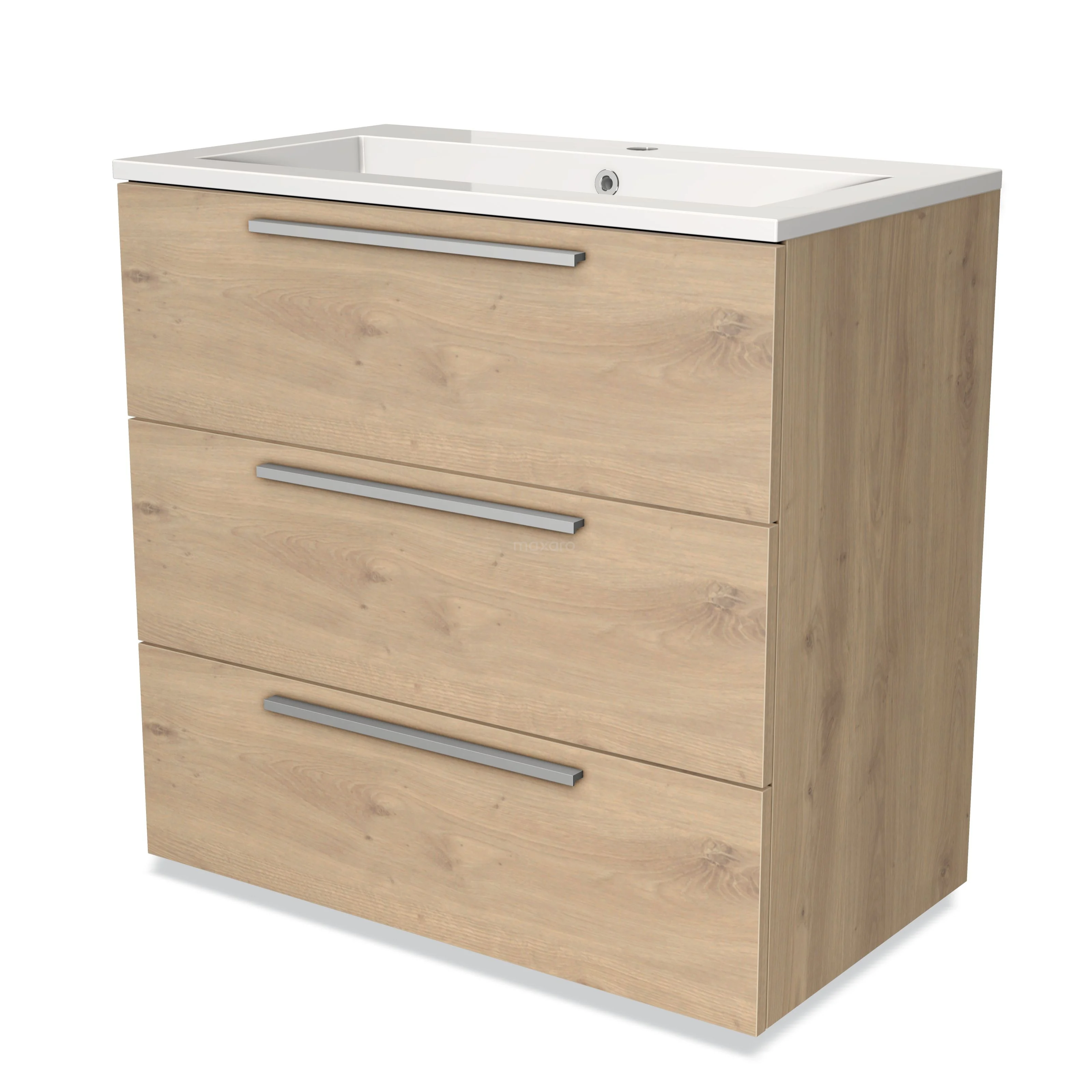 Modulo Waschtische | 80 cm Hellbraune Eiche Flach front Mineralguss 3 Schubladen