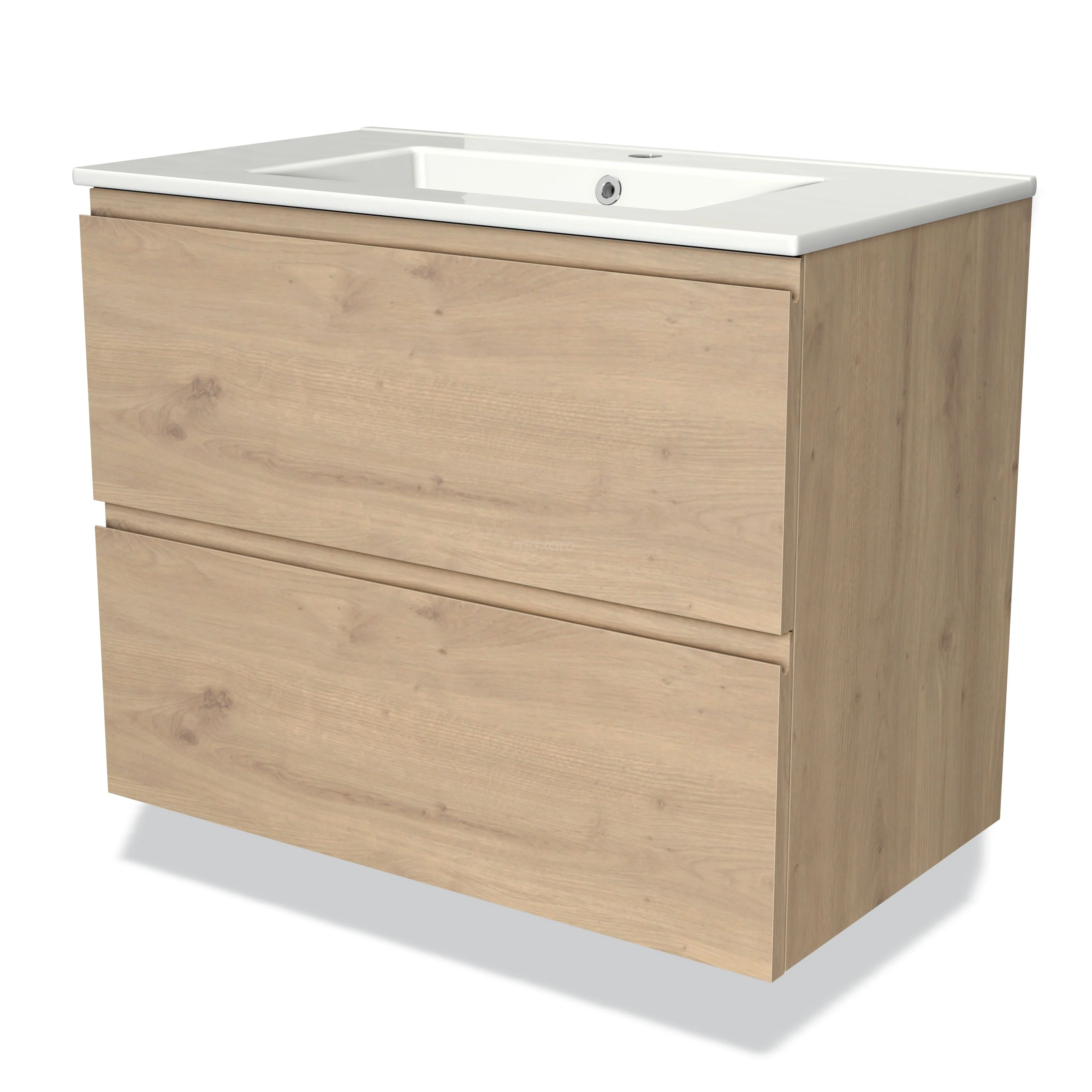 Modulo Waschtische | 80 cm Hellbraune Eiche Grifflos front Keramik 2 übereinanderliegende Schubladen