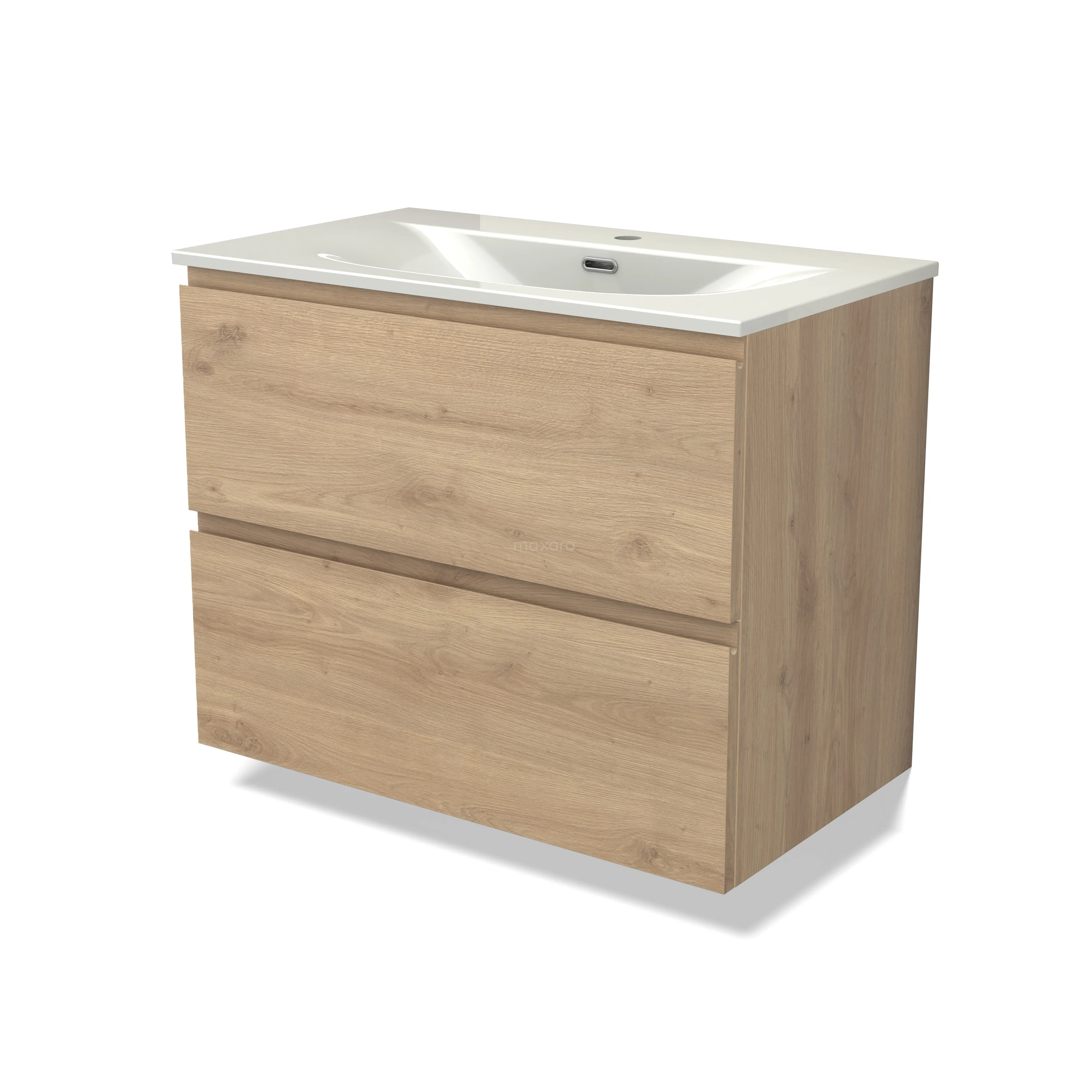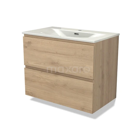 Modulo Waschtische | 80 cm Hellbraune Eiche Grifflos front Keramik 2 übereinanderliegende Schubladen