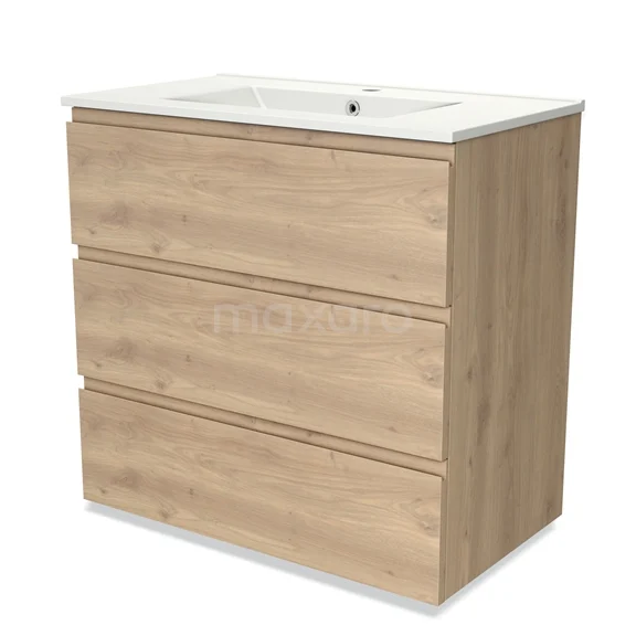 Modulo Waschtische | 80 cm Hellbraune Eiche Grifflos front Keramik 3 Schubladen