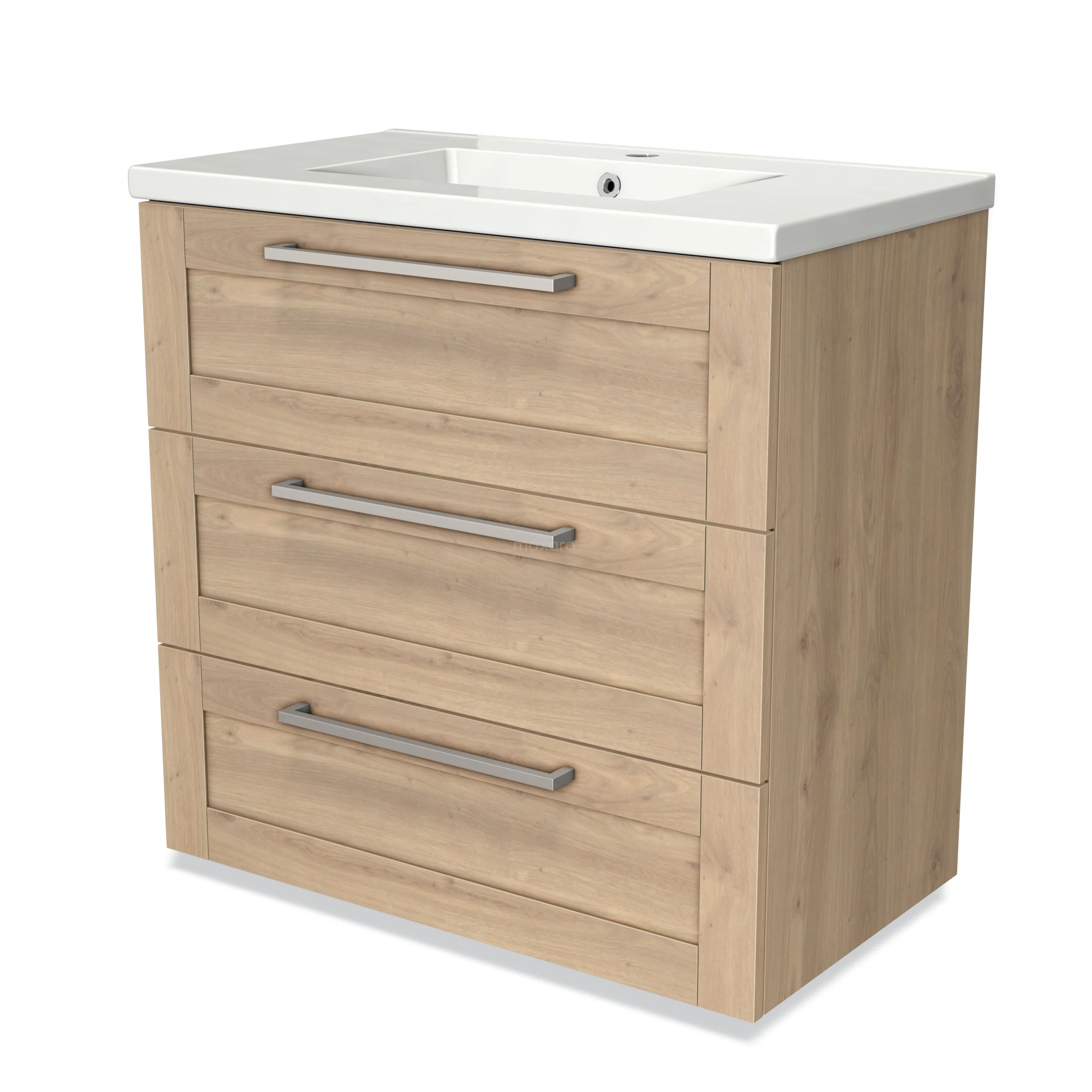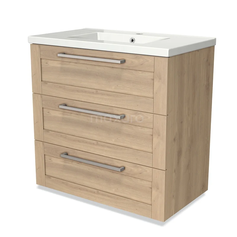 Modulo Waschtische | 80 cm Hellbraune Eiche Rahmen front Keramik 3 Schubladen