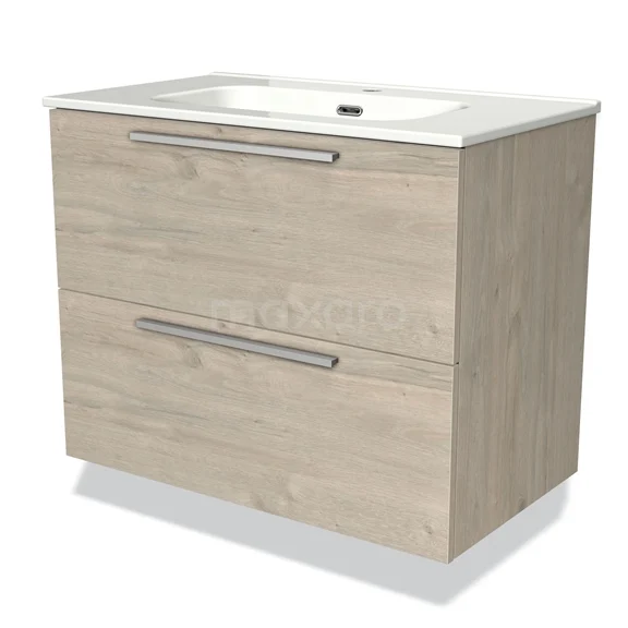 Modulo Waschtische | 80 cm Hellgraue Eiche Flach front Keramik 2 übereinanderliegende Schubladen