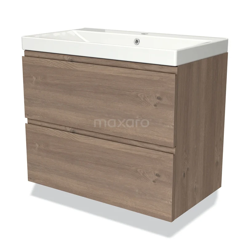 Modulo Waschtische | 80 cm Mittelbraune Eiche Grifflos front Keramik 2 übereinanderliegende Schubladen
