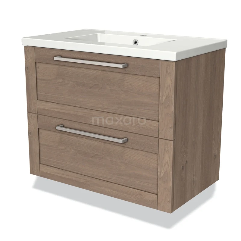 Modulo Waschtische | 80 cm Mittelbraune Eiche Rahmen front Keramik 2 übereinanderliegende Schubladen