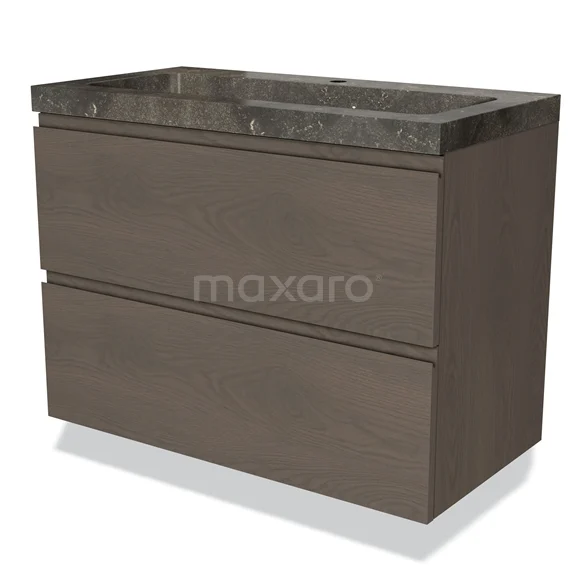 Modulo Waschtische | 90 cm Dunkelbraune Eiche Grifflos front Naturstein 2 übereinanderliegende Schubladen