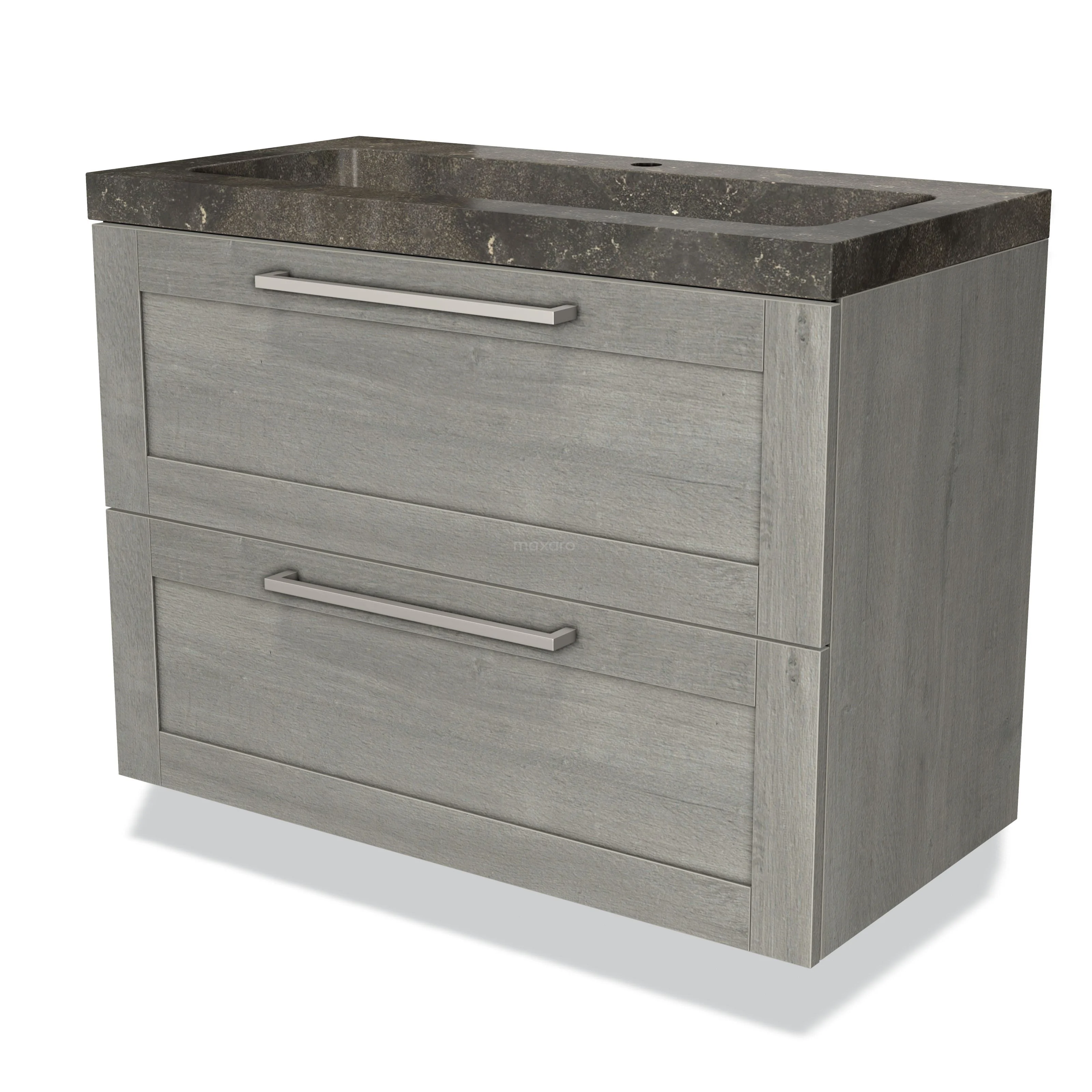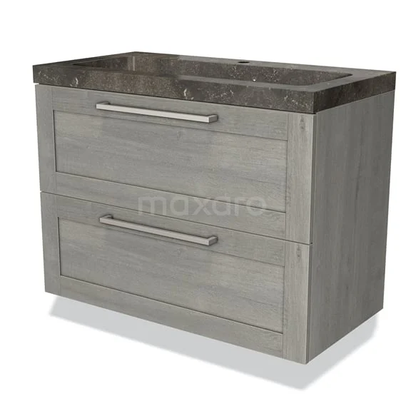 Modulo Waschtische | 90 cm Graue Eiche Rahmen front Naturstein 2 übereinanderliegende Schubladen