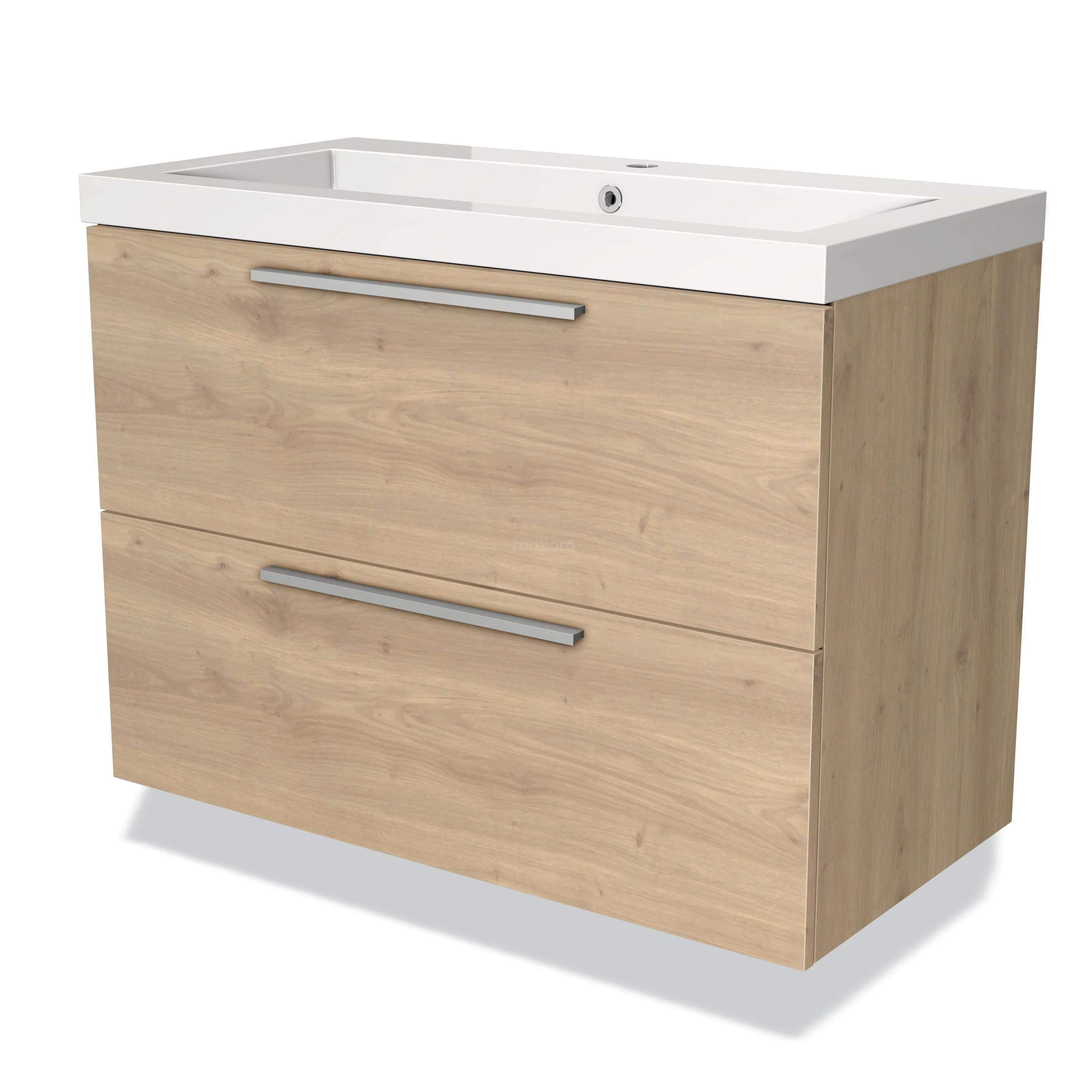 Modulo Waschtische | 90 cm Hellbraune Eiche Flach front Mineralguss 2 übereinanderliegende Schubladen