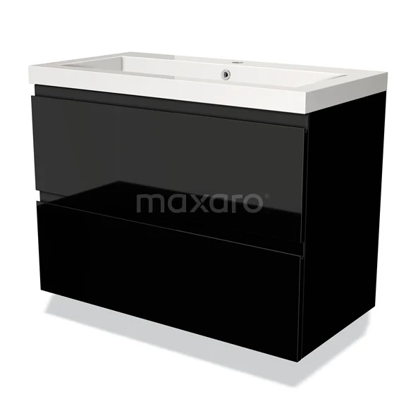 Modulo Waschtische | 90 cm Hochglanz Schwarz Grifflos front Mineralguss 2 übereinanderliegende Schubladen