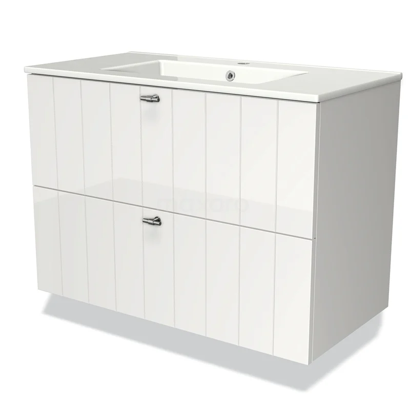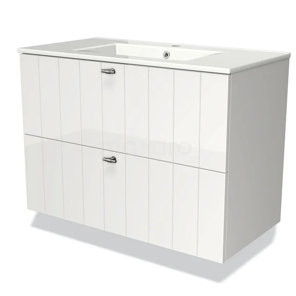 Modulo Waschtische | 90 cm Hochglanz Weiß Lamelle front Keramik 2 übereinanderliegende Schubladen