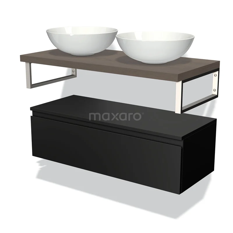 Modulo Plato Badmöbel mit Aufsatzwaschbecken | 100 cm Matt Schwarz Grifflos front Dunkelbraune Eiche blatt Tief hängend