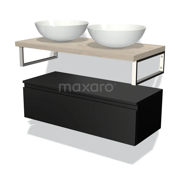 Badmöbel für Aufsatzwaschbecken 100 cm Modulo Plato Matt Schwarz 1 Schublade grifflos hellgraue Eiche Platte