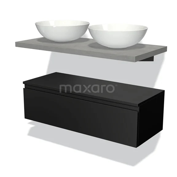 Modulo Plato Badmöbel mit Aufsatzwaschbecken | 100 cm Matt Schwarz Grifflos front Hellgrauer Beton blatt Tief hängend