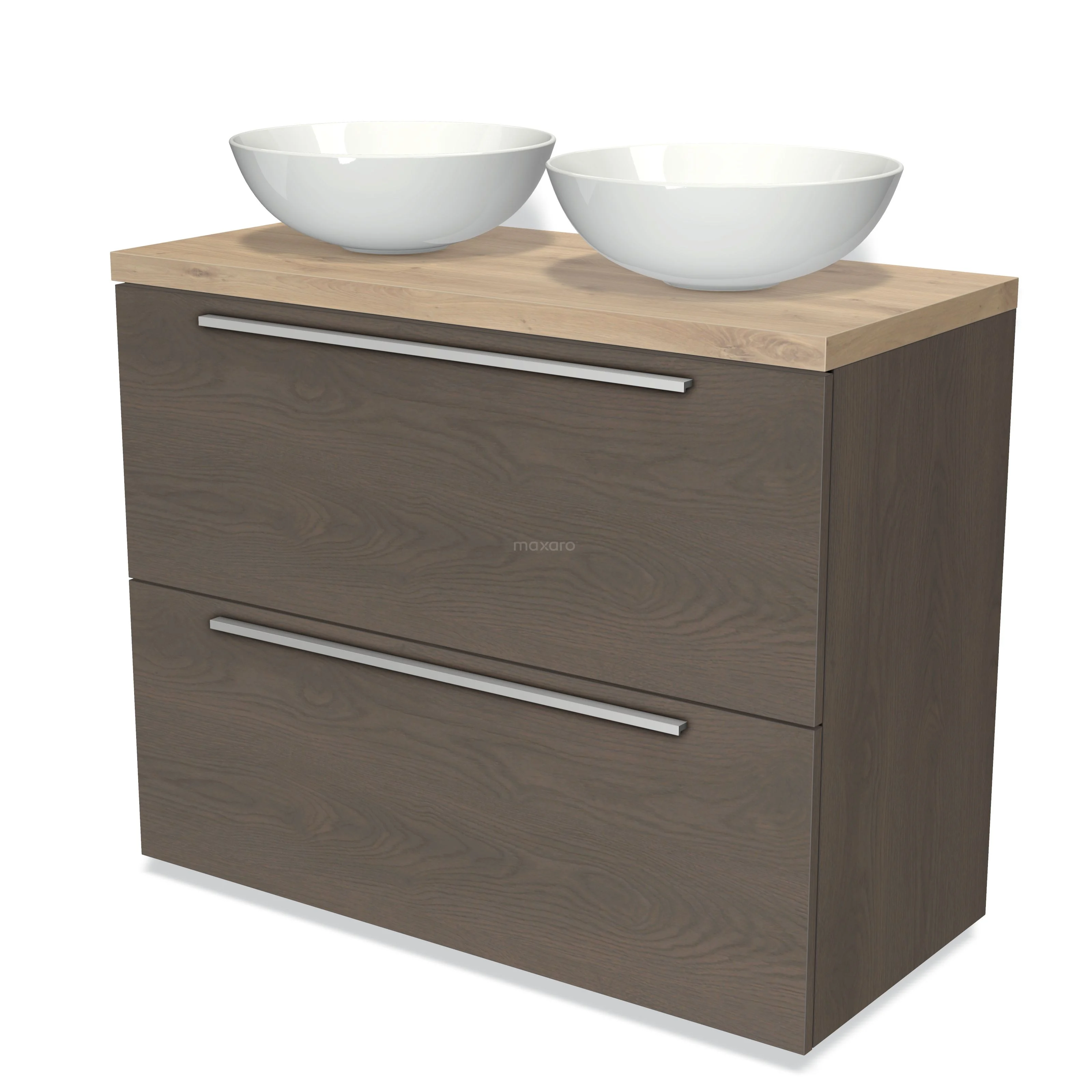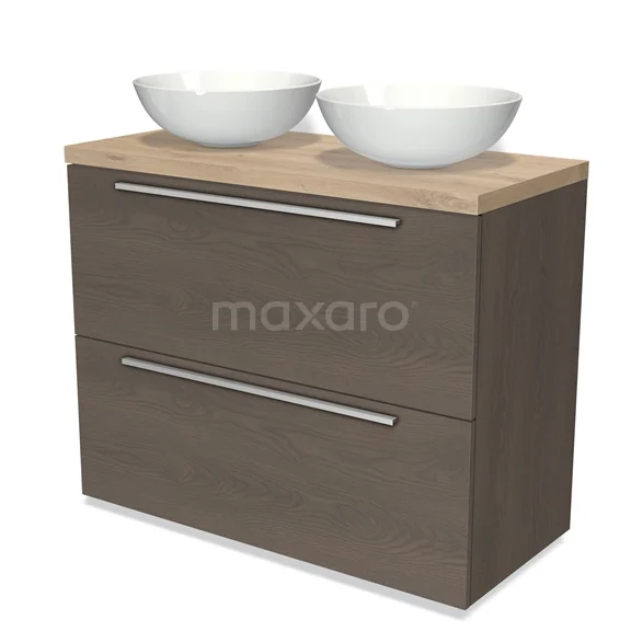 Badmöbel für Aufsatzwaschbecken 100cm Modulo Plato dunkelbraune Eiche 2 hohe Schubladen Flach hellbraune Eiche Platte