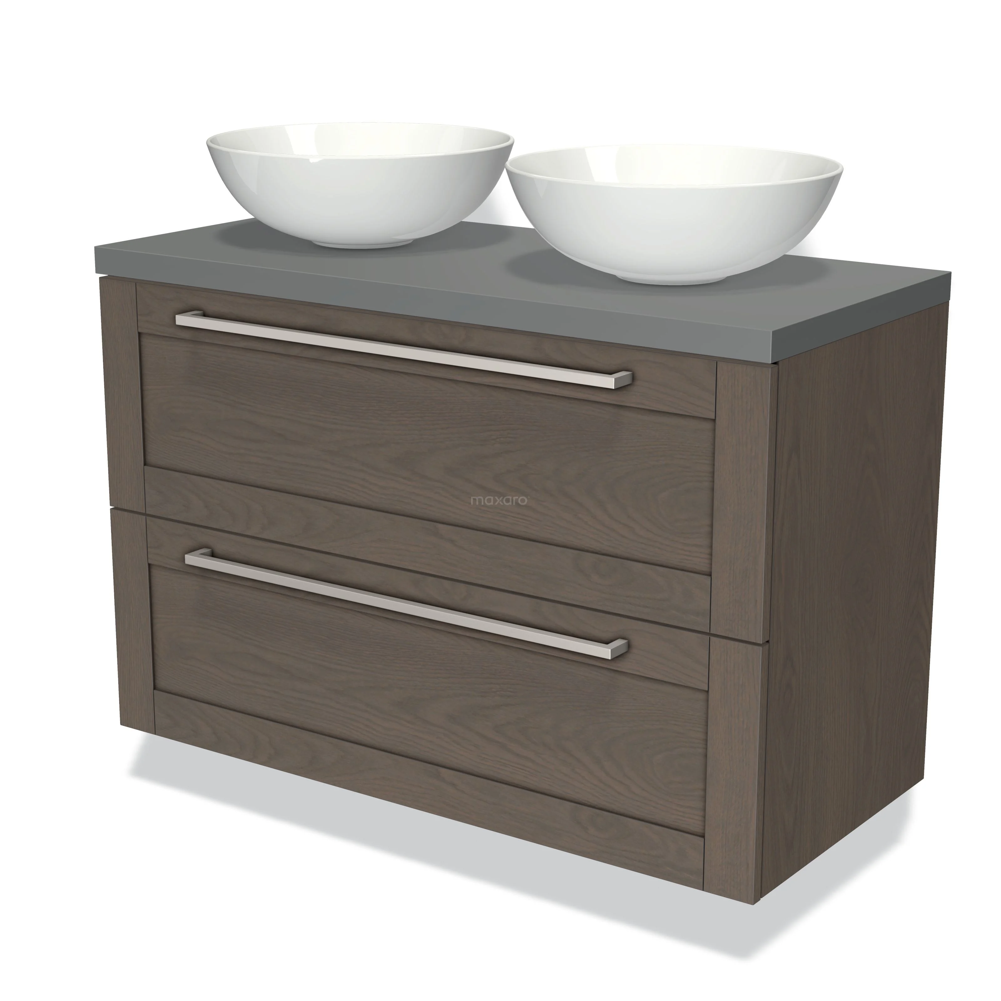 Badmöbel für Aufsatzwaschbecken 100cm Modulo Plato dunkelbraune Eiche 2 Schubladen Rahmen Mittelgrau Platte
