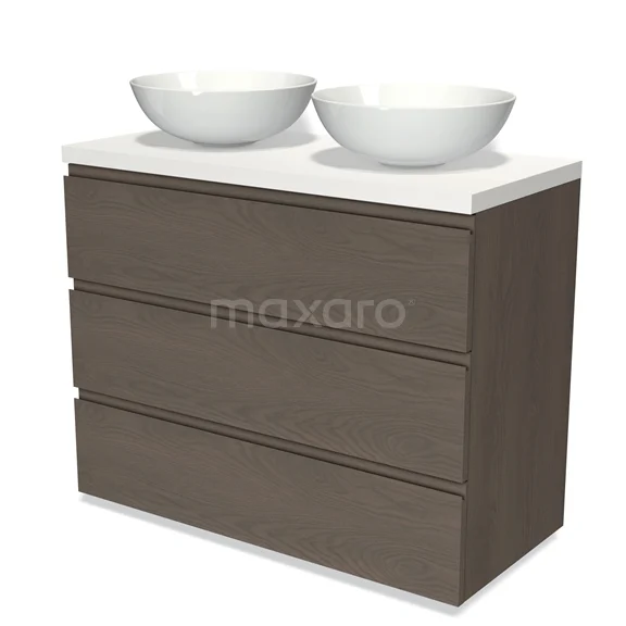 Badmöbel für Aufsatzwaschbecken 100cm Modulo Plato dunkelbraune Eiche 3 Schubladen grifflos Matt Weiß Platte