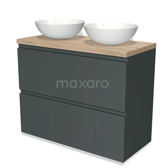 Badmöbel für Aufsatzwaschbecken 100cm Modulo Plato Dunkelgrau 2 hohe Schubladen Grifflos hellbraune Eiche Platte