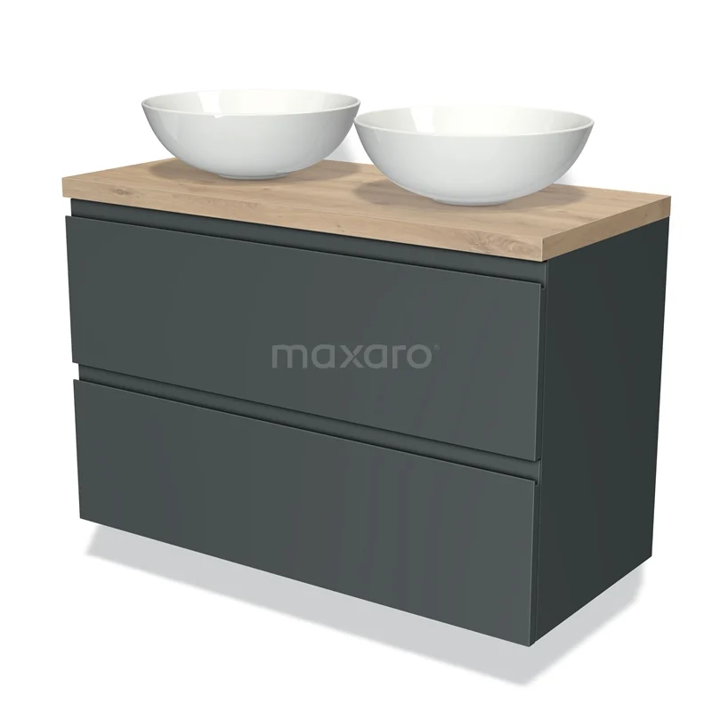Badmöbel für Aufsatzwaschbecken 100cm Modulo Plato Dunkelgrau 2 Schubladen Grifflos Hellbraune Eiche Platte