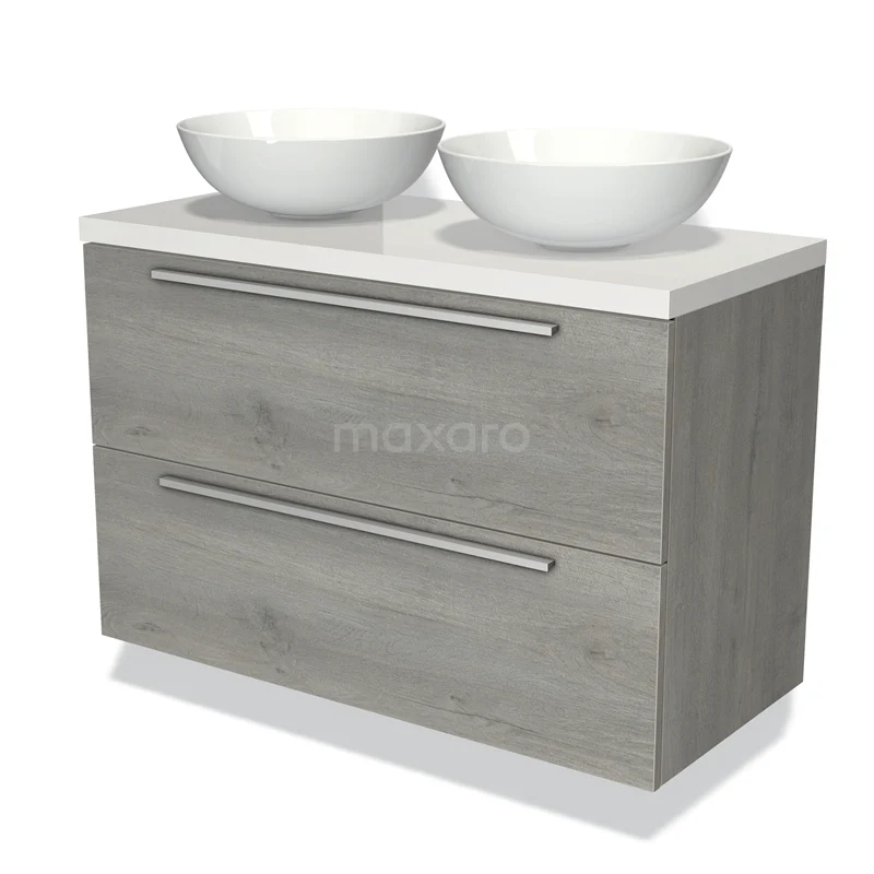 Badmöbel für Aufsatzwaschbecken 100cm Modulo Plato Graue Eiche 2 Schubladen Flach Hochglanz Weiß Platte