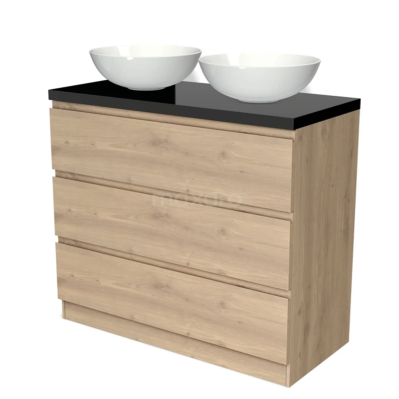 Badmöbel für Aufsatzwaschbecken 100cm Modulo Plato Hellbraune Eiche 3 Schubladen Grifflos Hochglanz Schwarz Platte