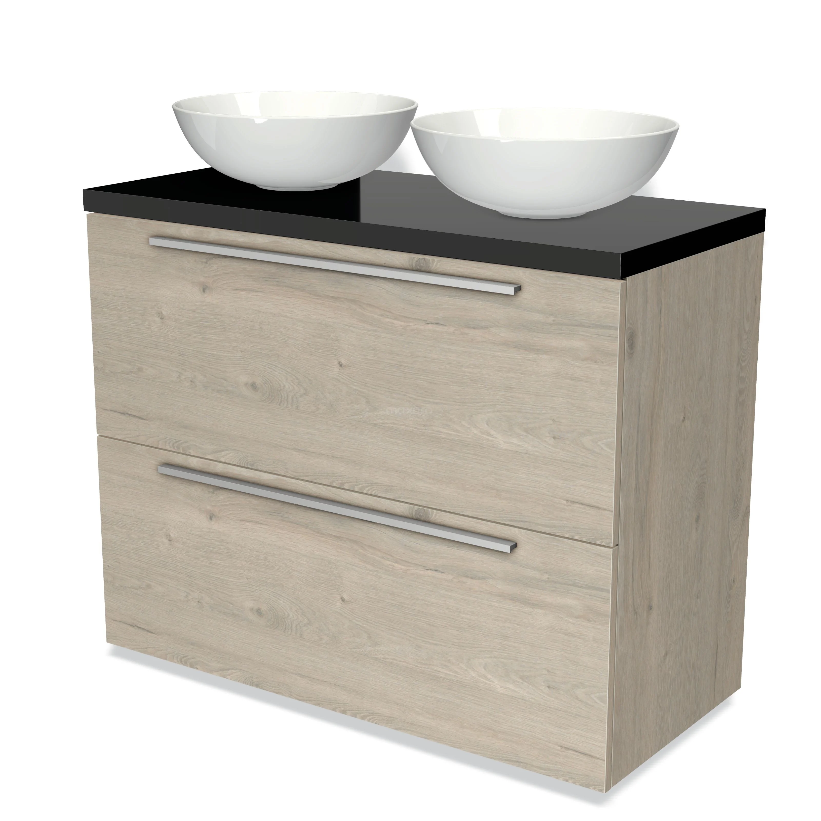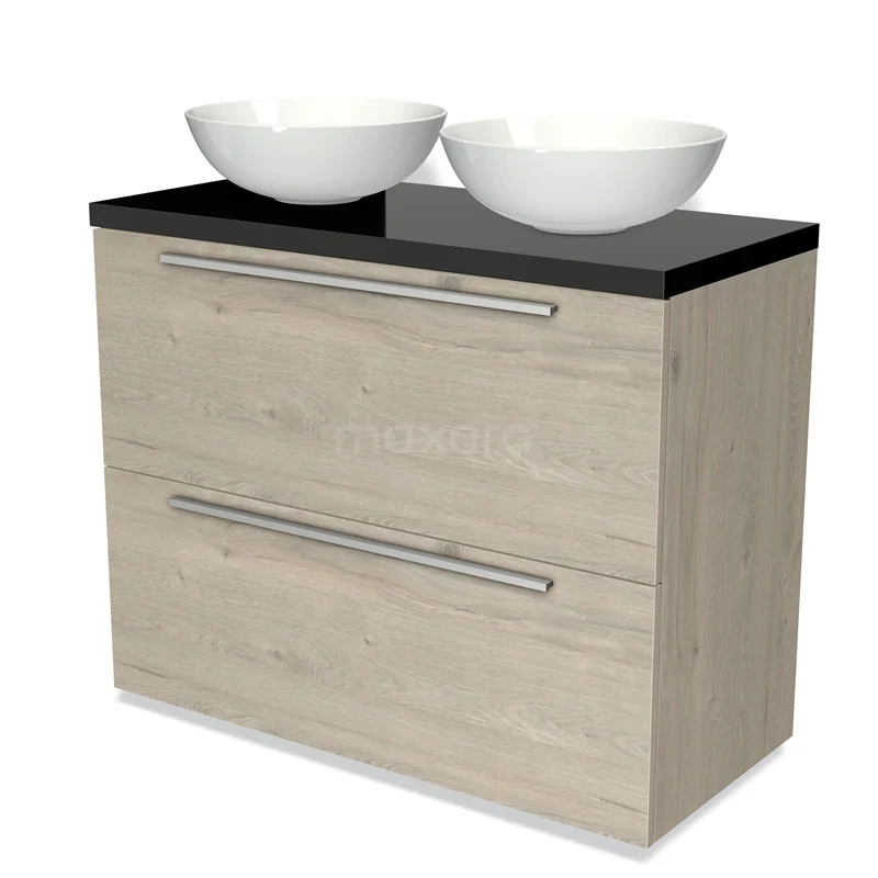 Badmöbel für Aufsatzwaschbecken 100cm Modulo Plato Hellgraue Eiche 2 hohe Schubladen Flach Hochglanz Schwarz Platte