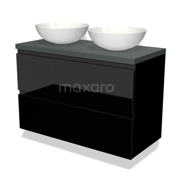 Badmöbel für Aufsatzwaschbecken 100cm Modulo Plato Hochglanz Schwarz 2 Schubladen Grifflos Dunkelgrau Platte