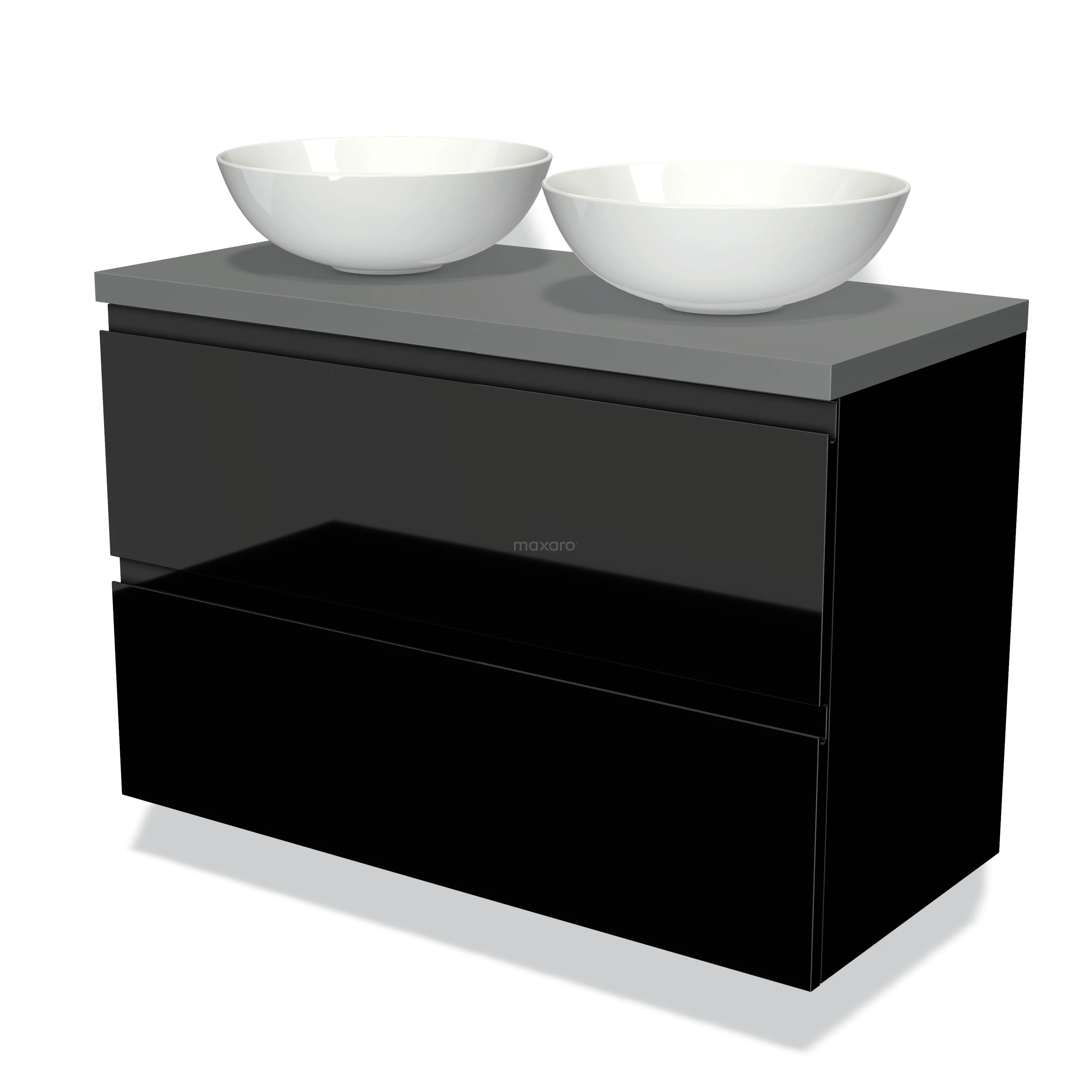 Badmöbel für Aufsatzwaschbecken 100cm Modulo Plato Hochglanz Schwarz 2 Schubladen Grifflos Mittelgrau Platte