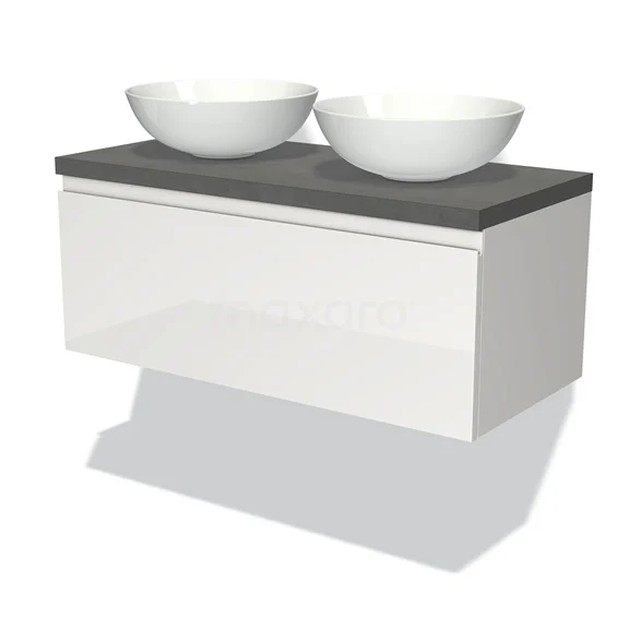 Badmöbel für Aufsatzwaschbecken 100cm Modulo Plato Hochglanz Weiß 1 Schublade Grifflos Dunkelgrau Beton Platte