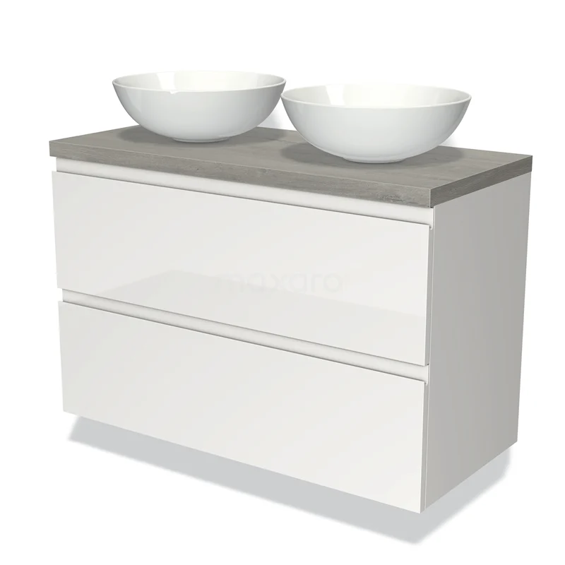 Badmöbel für Aufsatzwaschbecken 100cm Modulo Plato Hochglanz Weiß 2 Schubladen Grifflos Graue Eiche Platte