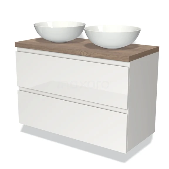 Badmöbel für Aufsatzwaschbecken 100cm Modulo Plato Hochglanz Weiß 2 Schubladen Grifflos mittelbraune Eiche Platte
