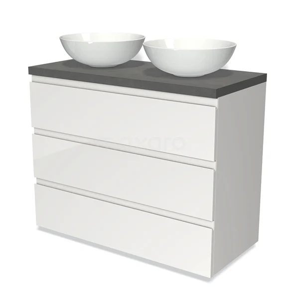 Modulo Plato Badmöbel mit Aufsatzwaschbecken | 100 cm Hochglanz Weiß Grifflos front Dunkelgrauer Beton blatt 3 Schubladen