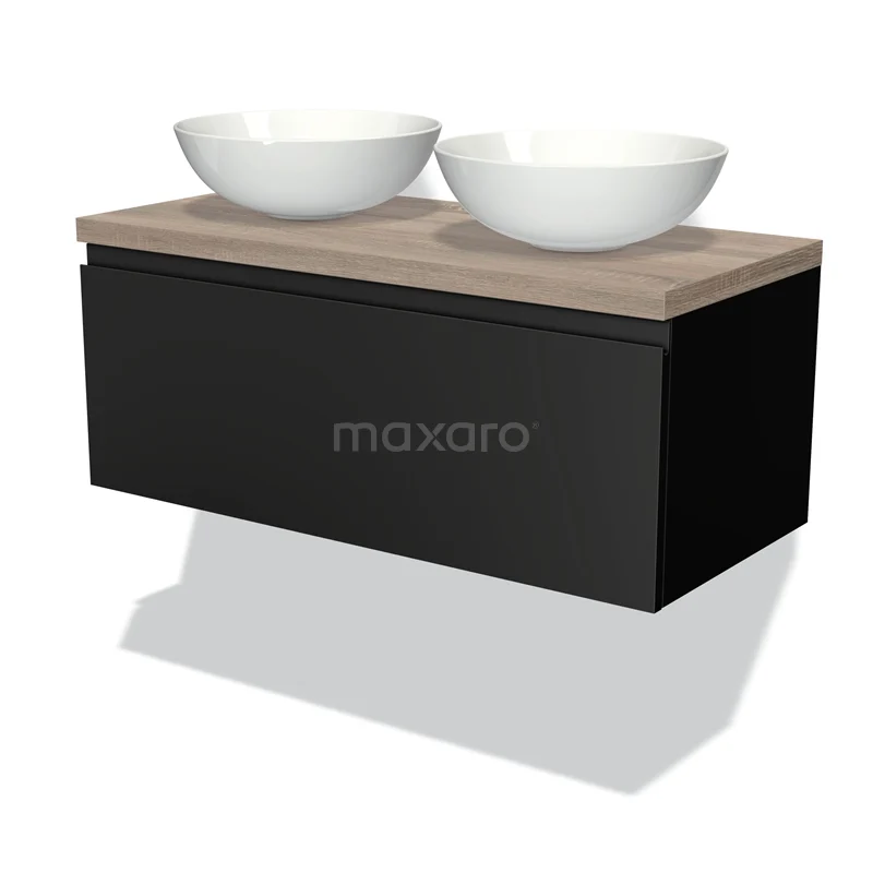 Badmöbel für Aufsatzwaschbecken 100cm Modulo Plato Matt Schwarz 1 Schublade Grifflose Platte Eiche