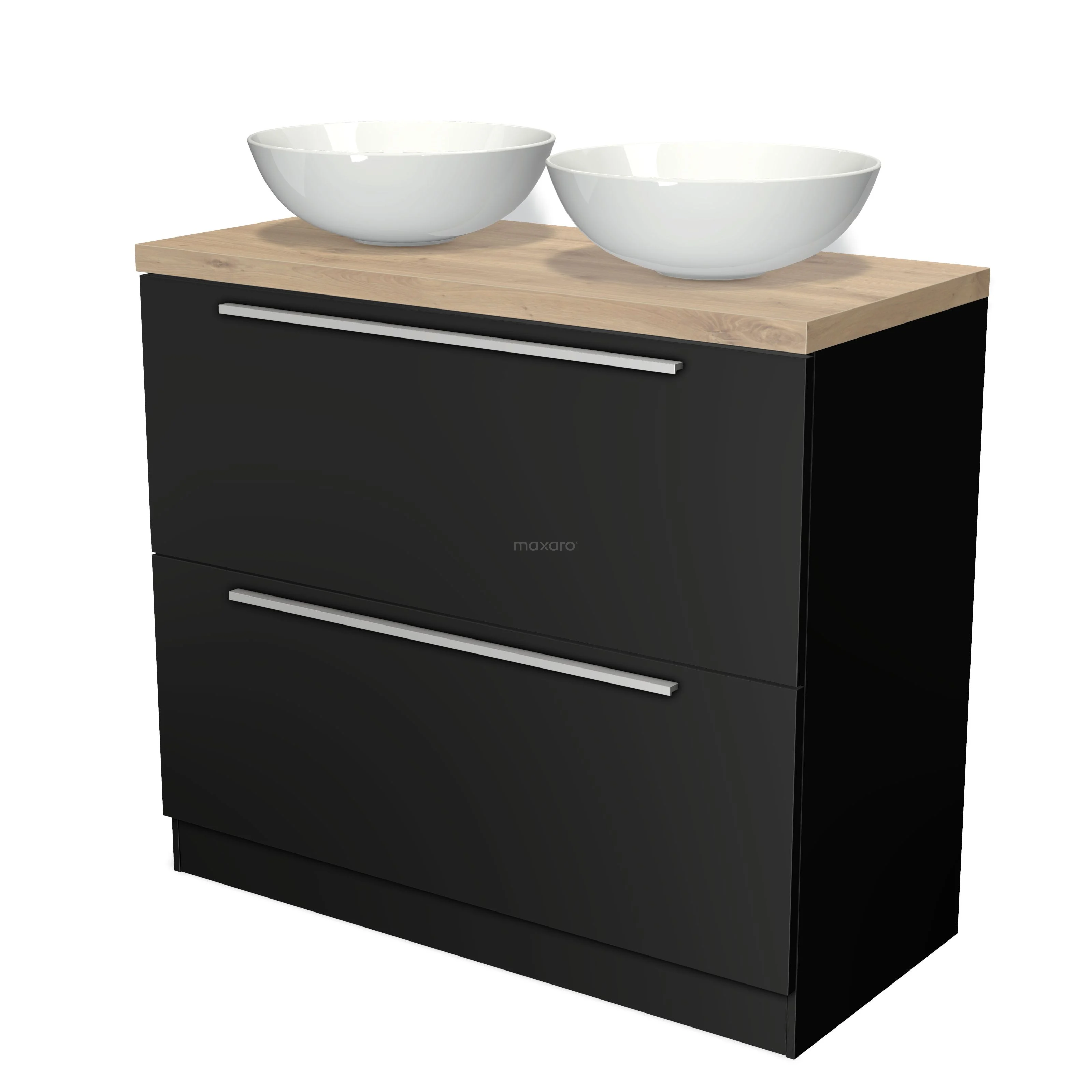Badmöbel für Aufsatzwaschbecken 100cm Modulo Plato Matt Schwarz 2 hohe Schubladen Stehend Flach Hellbraune Eiche Platte