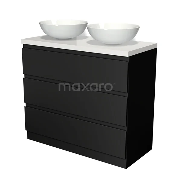 Modulo Plato Badmöbel mit Aufsatzwaschbecken | 100 cm Matt Schwarz Grifflos front Hochglanz Weiß blatt 3 stehende Schubladen