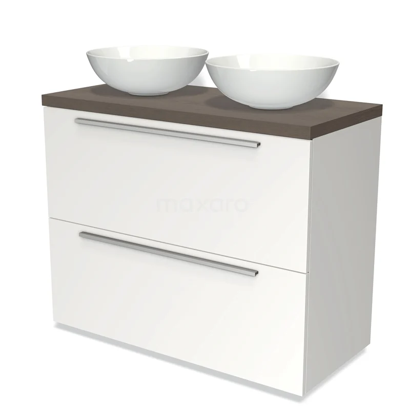 Badmöbel für Aufsatzwaschbecken 100cm Modulo Plato Matt Weiß 2 hohe Schubladen Flach Dunkelbraune Eiche Platte